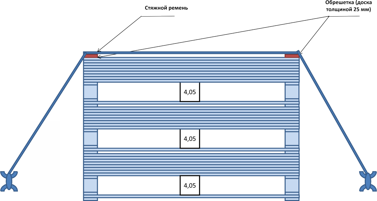 Панели крепится к поддону ПЭТ лентами шириной 19-20 мм поперек проката по каждому опорному бруску (рис.2). Лента должна быть закреплена не далее 1 см от края бруска. Затянутая лента не должна деформировать края панелей. Количество лент на поддон должно быть равно количеству опорных брусков, за исключением брусков, межосевое расстояние которых менее 950 мм. Дополнительно при отгрузке стопа панелей на поддоне фиксируется деревянными защитными уголками и ПЭТ лентами вдоль проката по каждому опорному бруску.