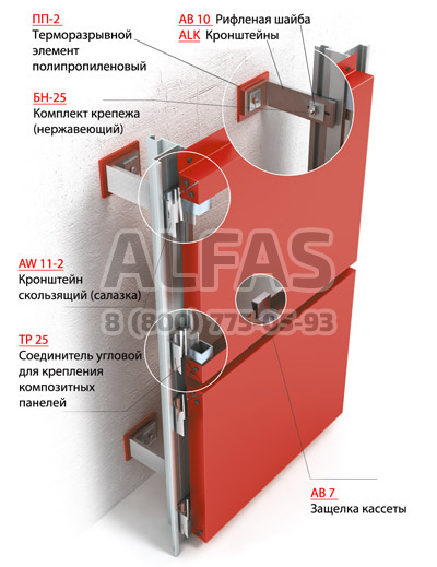 В системе Alucom KP крепление панелей облицовки осуществляется за счёт замка, образованного сочетанием скользящего кронштейна (салазки) и соединителя углового кассеты. При этом скользящие кронштейны (салазки) устанавливаются зеркально относительно друг друга, фиксируя облицовочную кассету в распор. Данный способ крепления обеспечивает высокую надёжность фиксации панели облицовки.